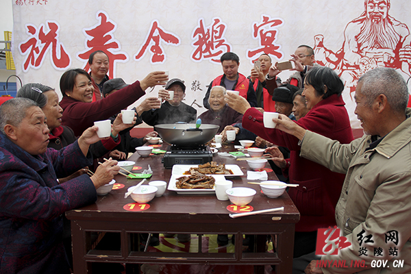 11:25,此次活动的重头戏--"百人古装祝寿全鹅宴"开始。电子商务产业园门口,数十张客家方桌一字摆开,福来喜鹅业有限公司团队为活动精心准备的"全鹅宴"菜肴依次上桌。随后,十位来自霞阳镇敬老院的老人与百名古装爱好者一起品尝火焰醉鹅、卤全鹅、卤鹅翅、卤鹅掌、酱香鹅、鹅汁云雾笋、炎陵米酒、艾叶米果,场面喜乐融融、温馨幸福。