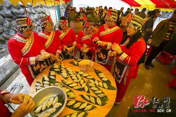 接下来的文艺演出活动主要以炎陵县的客家文化民俗节目三人龙和客家山歌的表演为主,同时穿插当地广场舞队伍的表演。演出中,年近80岁的老爷爷和老奶奶演唱的客家山歌《十敬茶》和《十劝郎》特别出彩,他们质朴而又投入的演唱,引发了现场群众的一片叫好。在美食品尝环节,热情的畲族人为客人们准备了艾叶饺、艾叶蛋、糍粑、粽子和当地的野菜。吃着地道的美食,客人纷纷称好。