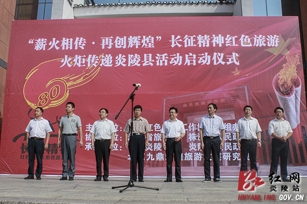 县委书记黄诗燕在致辞中说,今年是红军长征胜利八十周年,举办"薪火相传·再创辉煌"长征精神红色旅游火炬传递活动,就是要永远铭记苦难辉煌,永远传承红色基因,永远保持奋斗本色。他表示,炎陵是井冈山革命根据地的重要组成部分,这次火炬传递活动在炎陵举行,既是传递伟大的长征精神,也是展示炎陵良好的旅游形象。当前,中国梦、炎陵梦是我们的奋斗目标。实现炎陵梦,就要始终保持奋斗本色,要以"全面建设美丽幸福新炎陵"为总目标,坚持以炎帝文化为特征的生态旅游强县的发展定位;罗霄山脉湘赣边界旅游中心的区域定位;山水园林旅游城市的城市定位,把家园建设得更加美好。
