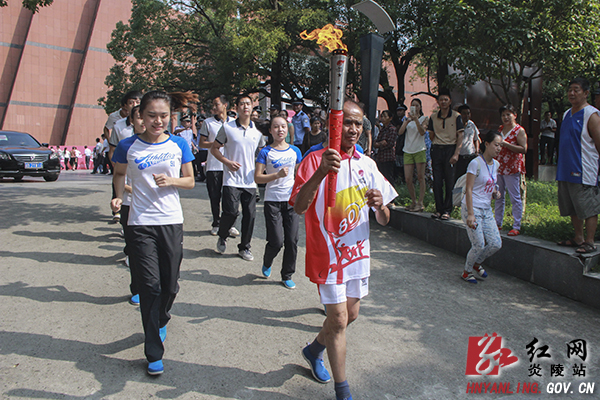 在大家的期待和注视中,株洲市领导郑重地将火炬传递给炎陵县领导,再依次传递到少先队员代表手中,最后由少先队员代表传递给火炬手。此次参加炎陵站传递活动的8名火炬手,年龄最大的是76岁的全国劳动模范马安健,年龄最小的是城南小学11岁的学生王伊漫。火炬传递过程中,火炬手们擎着熊熊燃烧的火炬,在护炬手的保护下,从红军标语博物馆出发,途经炎陵西路、中心广场,向烈士陵园进发。