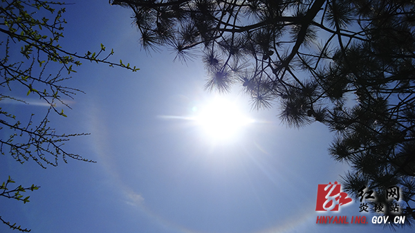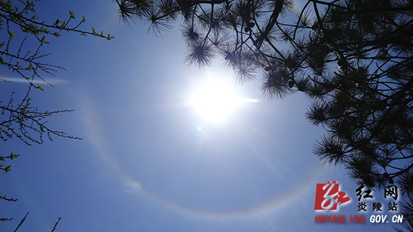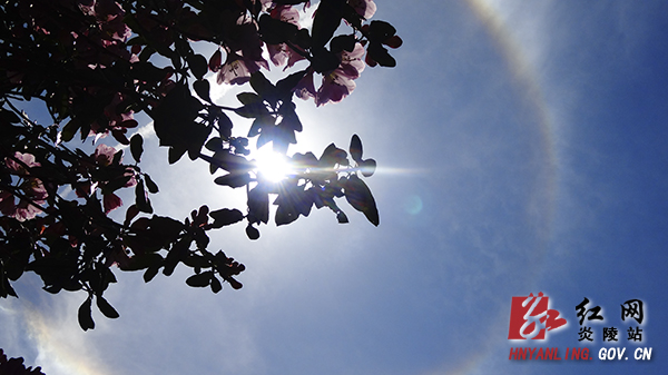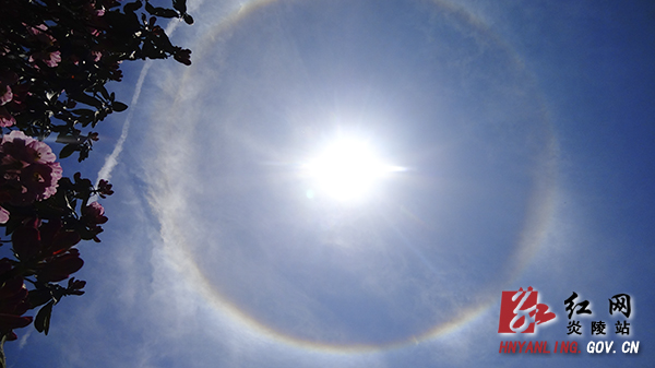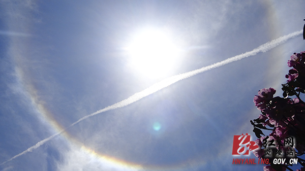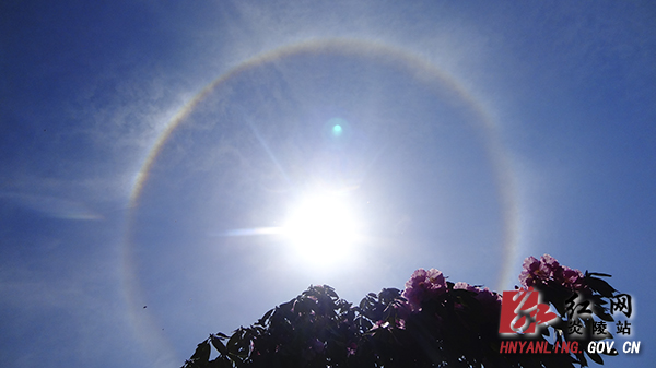 4月13日,13点45分左右,县林业技术人员在神农谷国家森林公园进行植物垂直分布考察时,看到梨树洲风景区的杜鹃云海上空的太阳周围,突然产生巨大而又明显的彩色光晕,引得考察一行人的"啧啧"称奇。当时一架飞机刚刚飞驰而过,大家都说第一次看到日晕,就碰上了杜鹃云海与日晕交相辉映,真是的奇观。日晕在持续约半个小时候后消失了,天空又恢复了清脆的湛蓝。