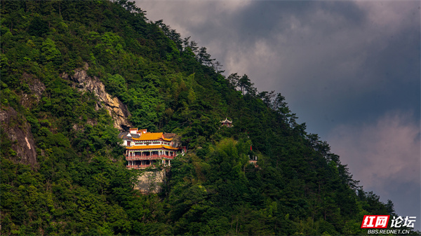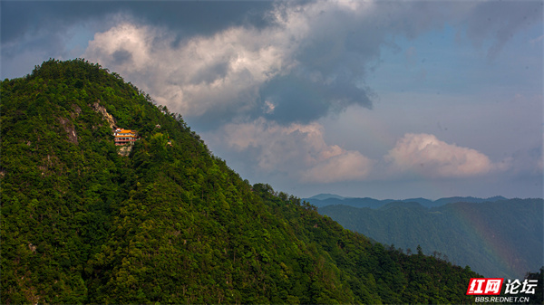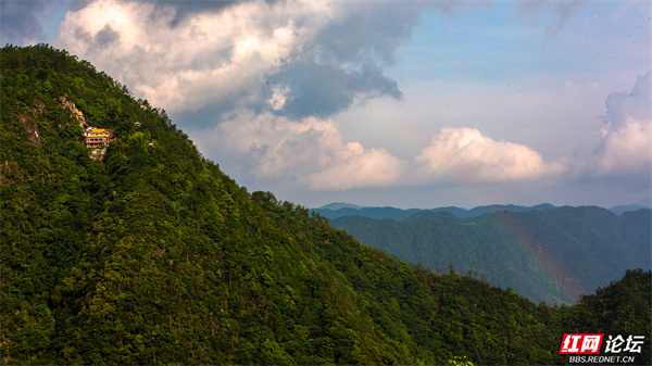 雨后初晴,炎陵铁瓦仙道观与谷底彩虹同框