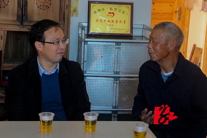 水口镇桃村原建档立卡贫困户、原党支部书记郭名禄已经85岁,他不等不靠,自力更生,目前已顺利脱贫。文专文充分肯定了郭名禄老党员过去为农村基层组织的建设和经济社会发展作出的积极贡献,鼓励他要敢于面对当前的困难和问题,乐观生活。