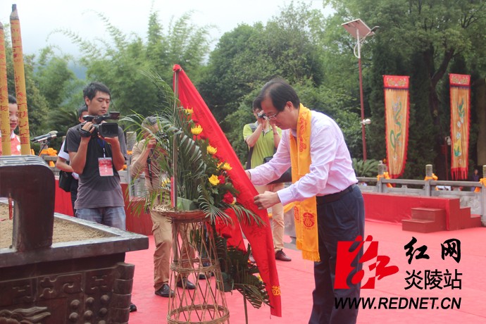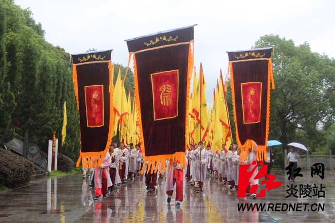 谒陵广场内龙狮齐舞,锣鼓齐鸣,唢呐齐奏,3条布龙来回穿梭,"中华龙"3字造型一蹴而就,拱起"龙门"。午门徐徐打开,嘉宾们穿过"龙门",缓步入午门,进行礼亭,举行陵殿祭典。中国国民党中央常务委员、世界客属总会理事长、京明照明集团董事长范成连,主祭人万魔声学科技有限公司董事长谢冠宏,株洲市政协主席蔡溪向始祖炎帝神农氏敬献高香。其他参祭人员向炎帝神农氏敬献线香。