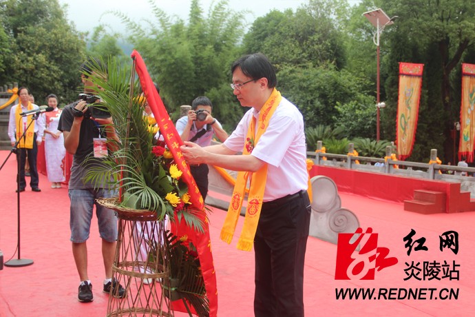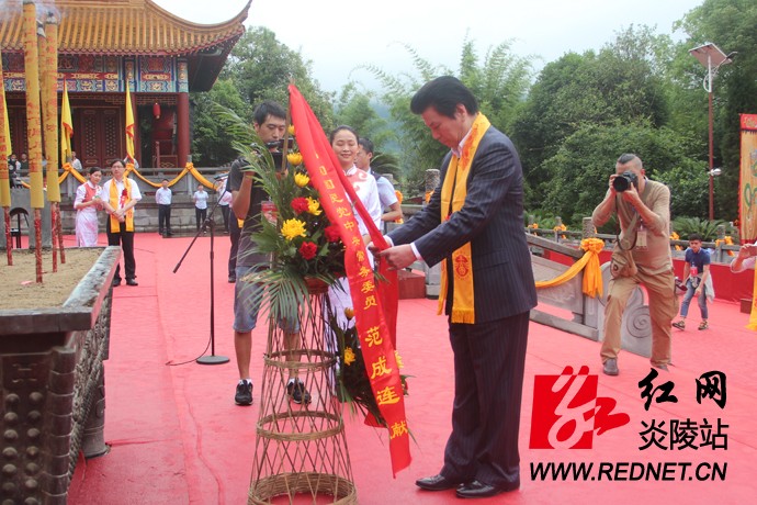 伴着悠扬的古乐,中国国民党中央常务委员、世界客属总会理事长、京明照明集团董事长范成连,万魔声学科技有限公司董事长谢冠宏,市政协主席蔡溪向中华民族始祖炎帝神农氏敬香,并和原湖南省人民政府副秘书长、原湖南省政府驻深圳办事处主任廖克勤,湖南省财政厅非税收入征收管理局局长陈其辉,市委常委、市委秘书长毛朝晖,副市长黄芳,市政协副主席、县委书记黄诗燕,县委副书记、县长文专文,深圳市秀美时尚科技有限公司董事长陈克勇,北京大学光华管理学院博士生导师、教授王立彦,中科院声学所博士生导师、教授李晓东,盈科资本董事长钱明飞、加一万魔声学科技(深圳)有限公司总经理林柏青、耳一号声学科技(深圳)有限公司总经理章调占依次向始祖炎帝神农氏敬献花篮。全体祭祖人员向始祖炎帝神农氏深鞠三躬,虔诚致敬,深情缅怀中华民族始祖炎帝之万代恩泽,表达对始祖炎帝神农氏的无限敬仰之情。