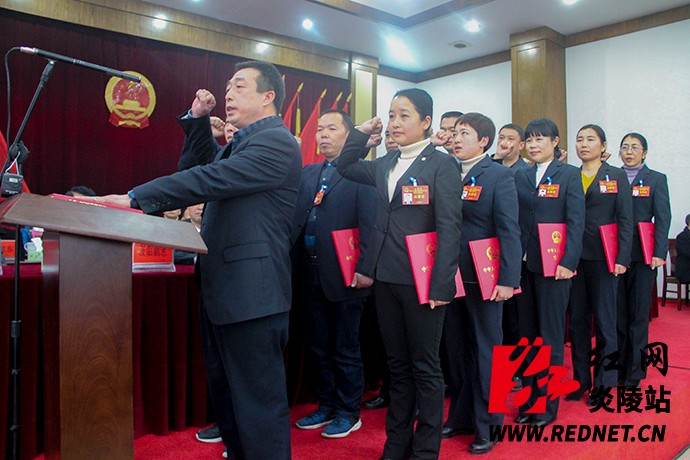 "我宣誓,拥护中华人民共和国宪法,维护宪法权威,履行宪法职责,恪尽职守、廉洁奉公……",新当选的县监察委员会主任、县十七届人大常委会委员和法制委员会、财政经济委员会、城乡建设环境资源保护委员会成员向宪法庄严宣誓。