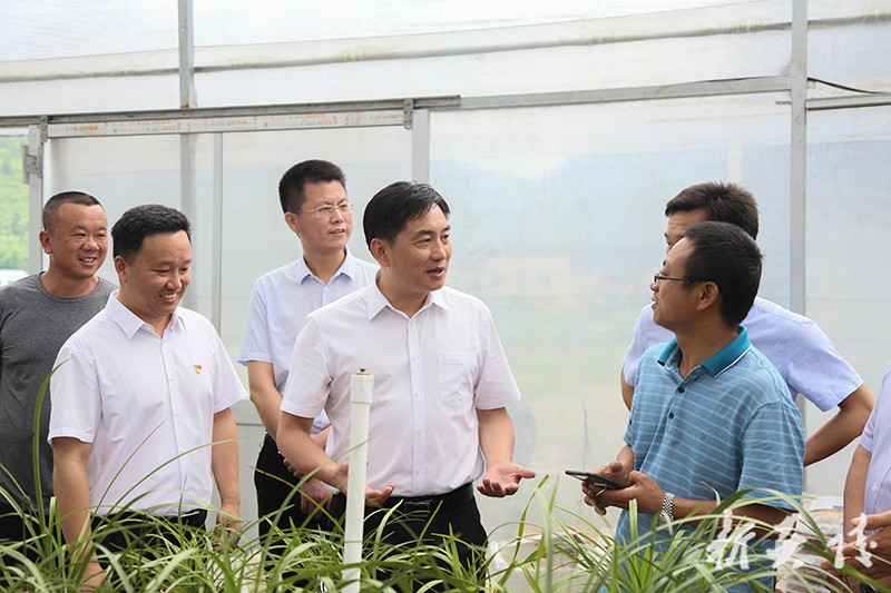 船形乡同睦村花卉基地采取"龙头企业+合作社+标准化"模式,着力推动兰花产业加快发展。目前基地年产值过千万元,带动当地三十余名劳动力稳定就业。尹朝晖走进大棚,查看兰花长势,详细了解基地经营情况。他希望基地负责人把"小兰花做成大产业",突出兰花的文化内涵,打响"炎陵兰花"的品牌,充分发挥产业带动效应,带领更多贫困户实现稳定增收。