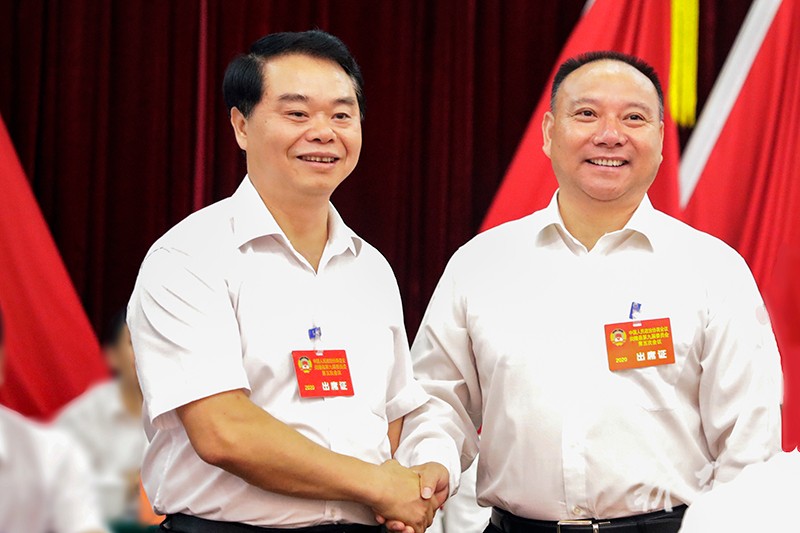 县政协党组书记、大会临时党委书记欧阳鹏志(左)与新当选的政协主席黄建中(右)握手