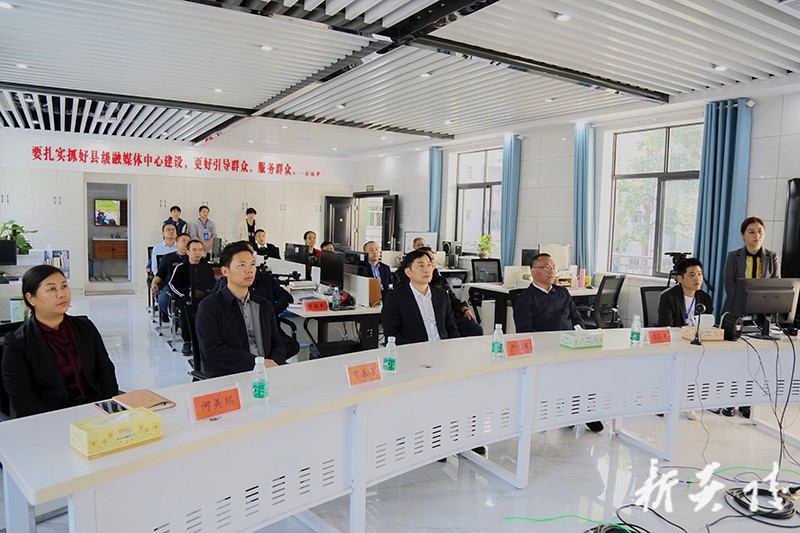 ▲县委书记尹朝晖来到广播电视台(融媒体中心)指挥调度中心观看媒体融合汇报片