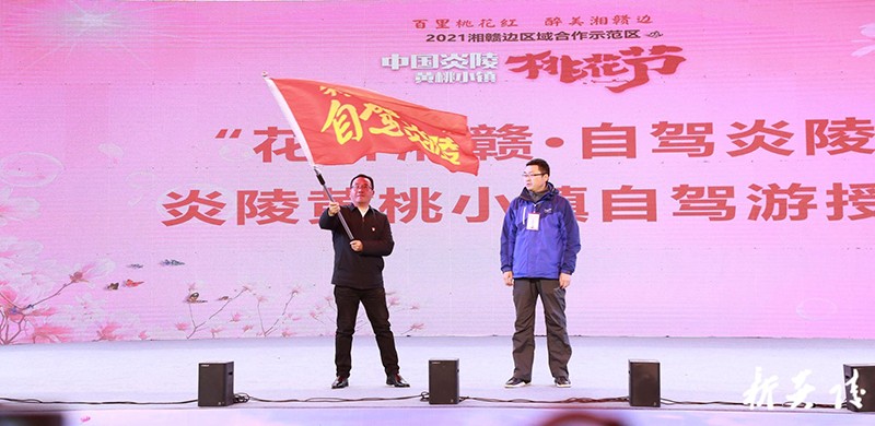 ▲“花开湘赣自驾炎陵”黄桃小镇自驾游授旗