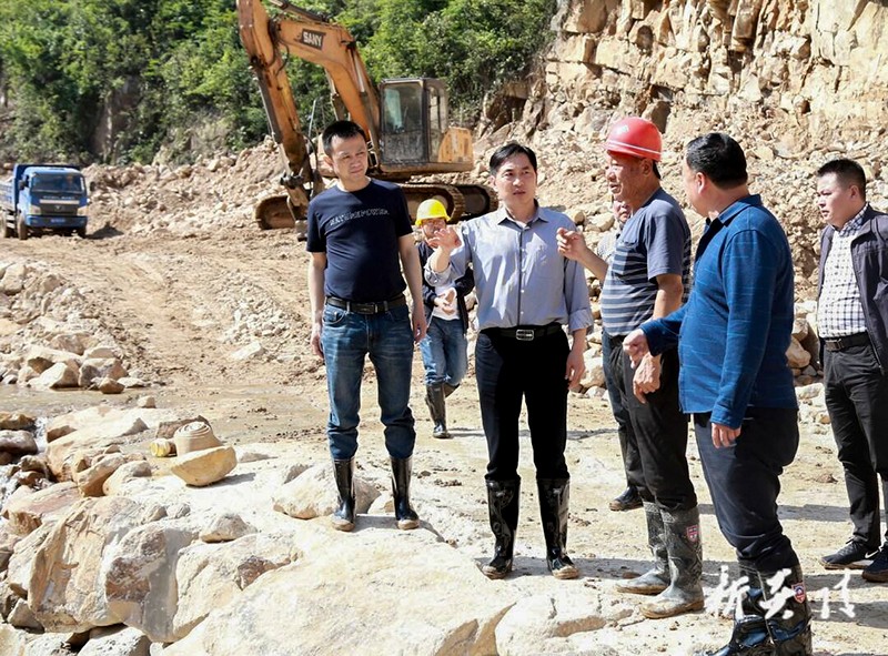 在鹿原镇西塘村,尹朝晖来到田坪冲水库建设现场,实地查看项目建设进度,督导各项安全生产制度落实情况。田坪冲水库为小(Ⅱ)型水库,目前正在进行坝体砌筑工作。