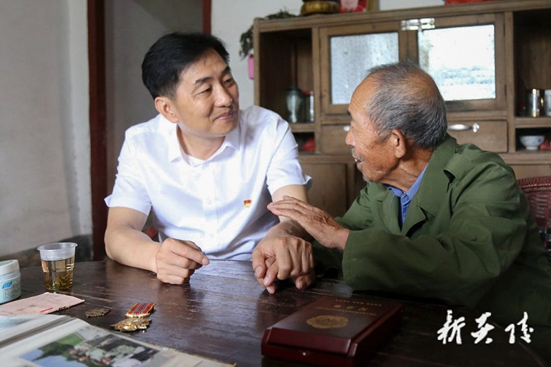 ▲尹朝晖看望慰问抗美援朝老军人、老党员游克源并为其颁发纪念章