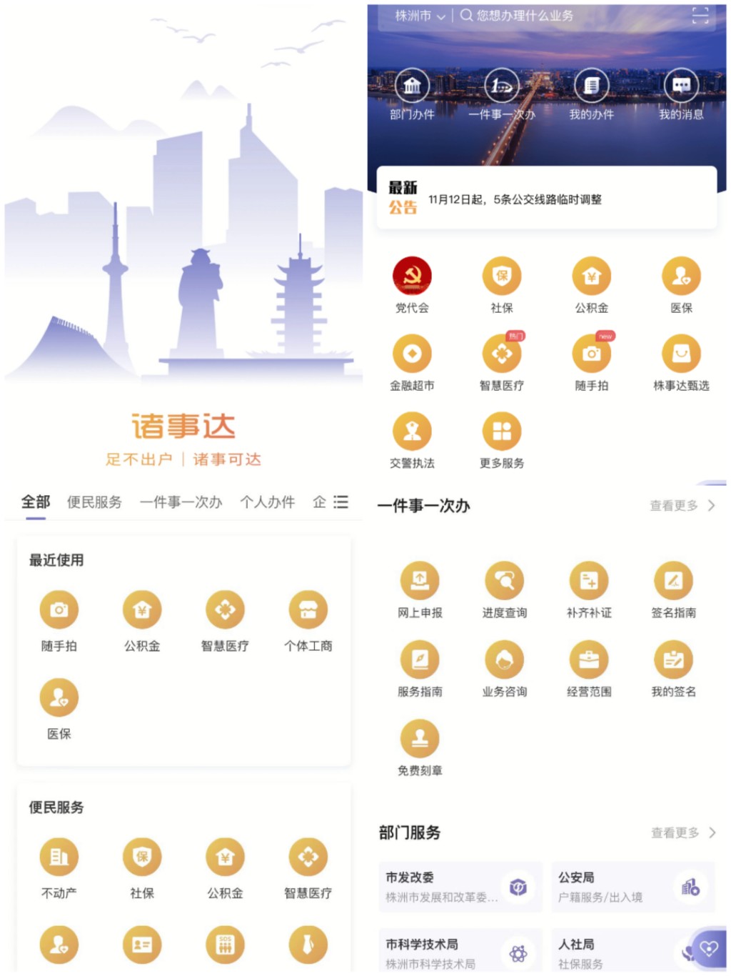 “诸事达”APP是株洲市政府推出的移动端一站式城市综合服务平台,目标是让株洲市民用一个APP即可尽享全面的政务、民生以及生活服务。
