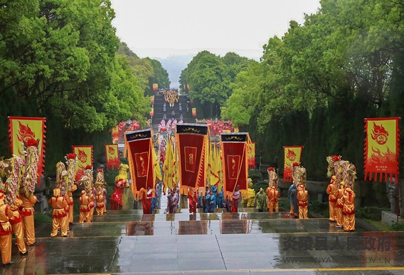 上午9时许,炎帝陵阙门广场上锣鼓喧天、气氛热烈。全体参祭人员整齐列队,在仪仗队伍的引导下,经鹰鹿广场、咏丰台、八卦广场,抵达祭祀广场,静候仪式开始。