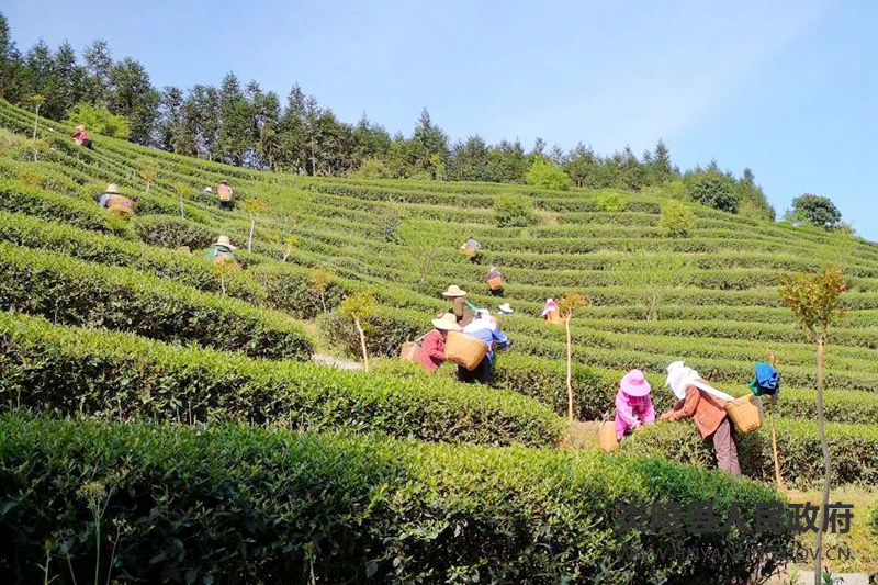 霞阳镇石子坝村村民们正在集体经济茶叶园内采摘春茶。