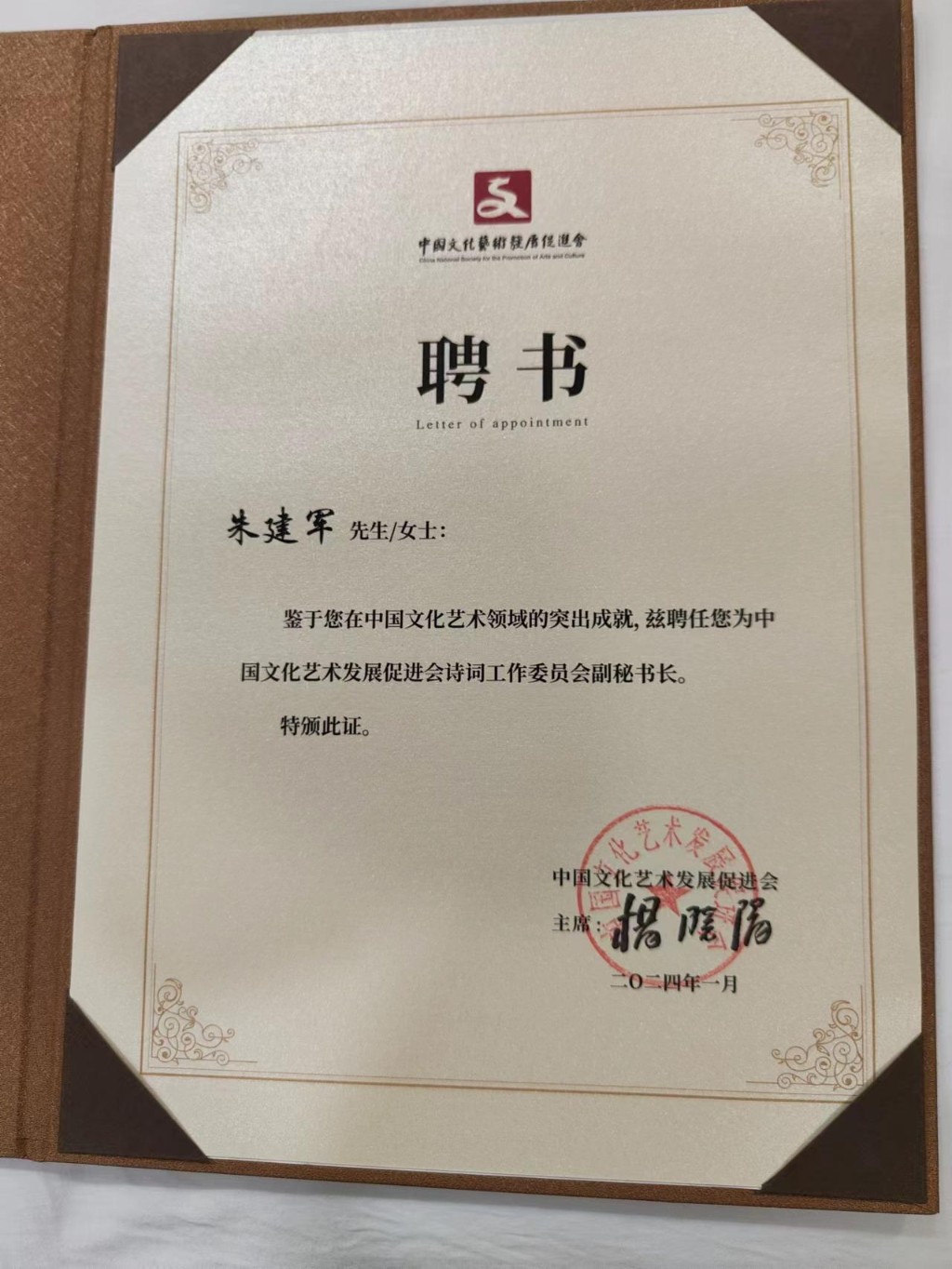 在本届诗词春晚现场,朱建军还被中国文化艺术发展促进会聘任为诗词工作委员会副秘书长。