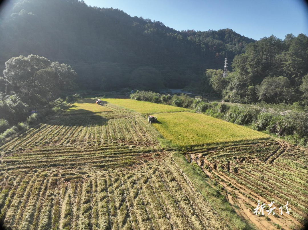 浏览次数: 发布时间:2024-11-07 08:45风和日丽的晚秋,在湘赣边罗霄山脉脚下的炎陵县城,我们驱车沿霞阳镇政府旁的小路一直往南,七拐八拐到了石玉村龙潭组,在四周被山包围的山旮旯里一位衣着简式夹克的农民,戴个泛白的鸭舌帽,扛个小锄头,微弯曲的脊背, 黑棕色的脸庞,正在夕阳余晖洒照的田间指挥三台收割机抢收晚稻,只见翻滚的稻秆渣不断地从收割机吐出来,几个回合下来,装运稻谷的农用车拖斗已经隆成小山式的稻谷包。