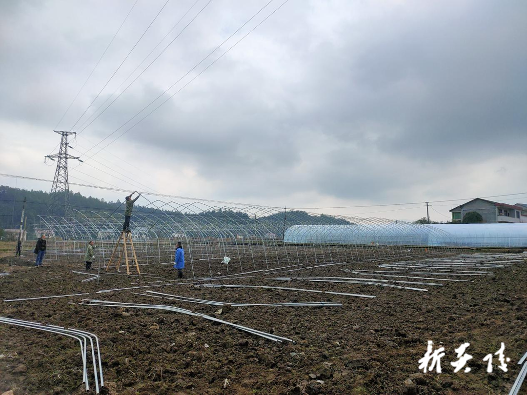 在基地里,20多位村民正在热火朝天地忙碌,地里的杂草被清理得干干净净,村民们扶梯子、递架子,高效有序地搭建温室大棚。