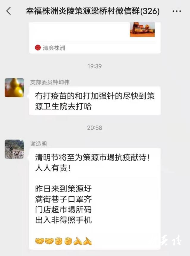 据了解,策源乡积极开展“敲门行动”,加强对重点场所的防疫管理,乡农贸市场实行一个口子进出,引导村民戴好口罩、扫码、测量体温,督促辖区机关企事业单位、商店、农家乐开展场所码申领和应用,并实现100%全覆盖;持续通过巡逻车、村村响、微信群、发放《一封信》等方式宣传当前最新形势和防控要求,并倡导在外人员清明期间非必要不返乡,重点做好60岁以上暂未疫苗接种人员的动员和服务等一系列工作,努力引导群众自觉做好防控,达到群防群控的良好氛围。