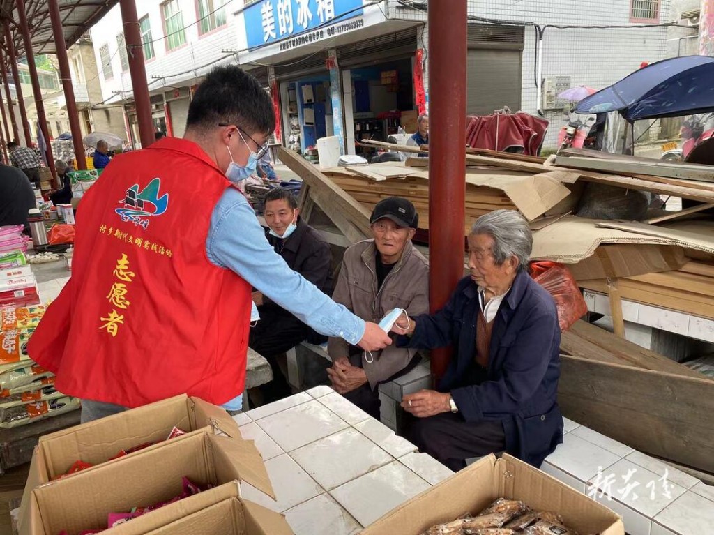 鹿原镇文明实践志愿者开展疫情防控劝导活动。在墟场发放口罩,引导群众扫场所码,戴口罩。(鹿原镇/张雨)