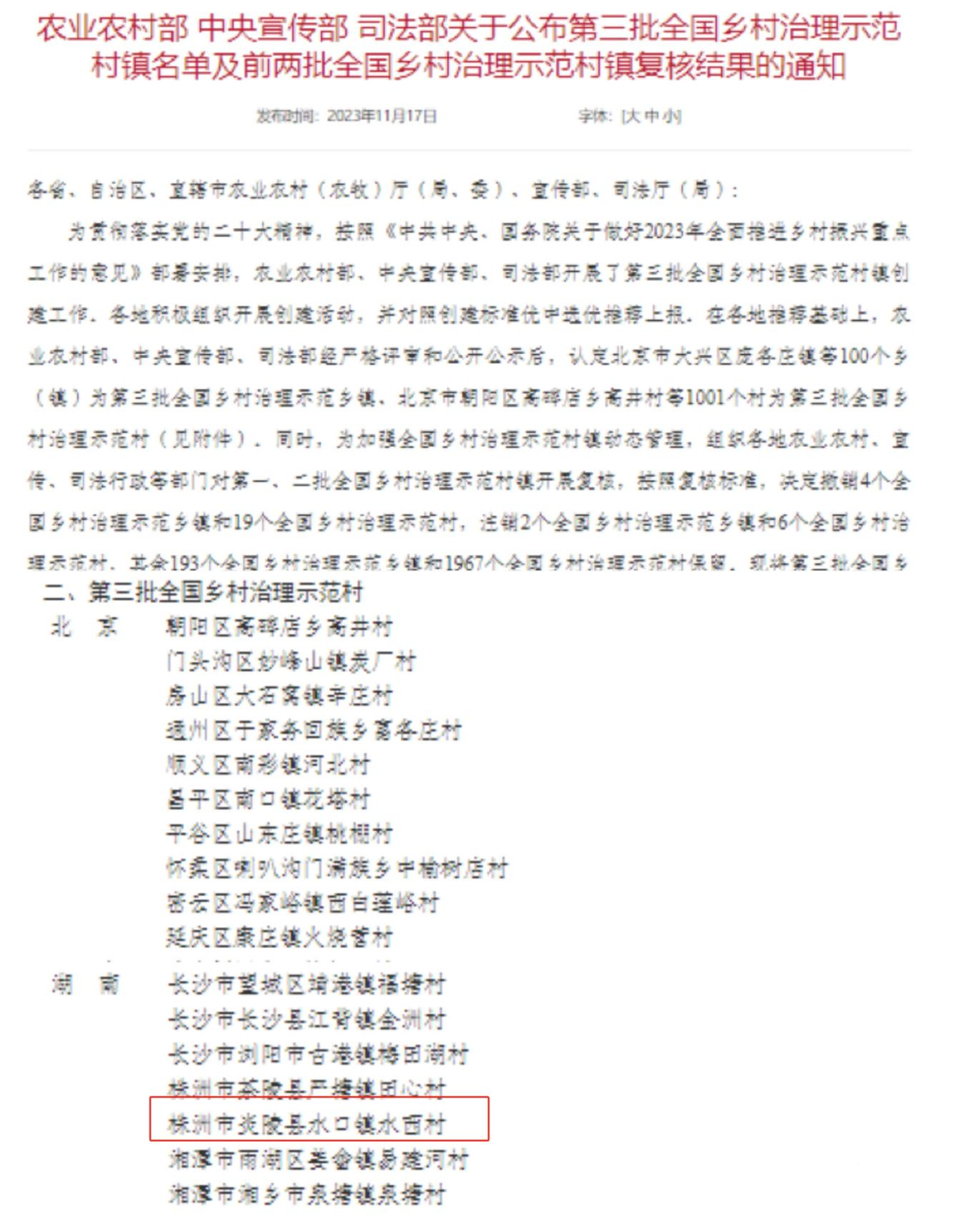 近日,农业农村部、中央宣传部、司法部印发了《关于公布第三批全国乡村治理示范村镇名单及前两批全国乡村治理示范村镇复核结果的通知》,湖南省5乡(镇)、50村入选,其中,炎陵县水口镇水西村榜上有名。