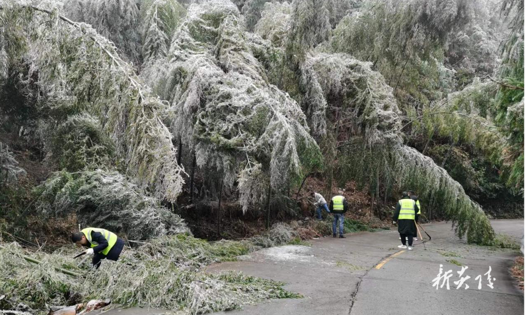 下村乡主要领导、志愿者等人一行,身穿反光马甲,拿着砍刀、扫帚等工具在下村乡辖区内的积雪结冰路段消除安全隐患。他们一人拽着竹子,一人挥舞着砍刀,配合默契地将因结冰而倒下的竹子砍除,再一起将竹子拖至道路两旁,用扫帚扫净散落在地面的积雪、冰块,一切井然有序。在大家的努力下,下村乡辖区内的道路安全隐患已基本清理完毕。