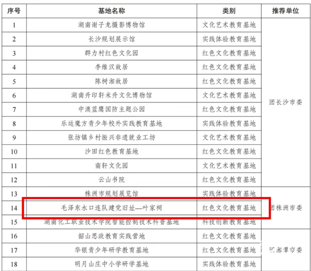 近日,共青团湖南省委公布了第三批湖南省青少年教育基地名单,全株洲市共有3个单位名列其中。经过前期申报、审核评估,位于炎陵县水口镇的“毛泽东水口连队建党旧址——叶家祠”作为红色文化教育基地成功入选。