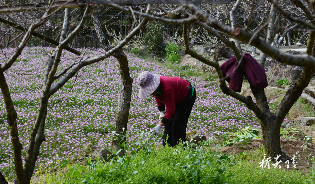 桃林深处,与蜂蝶一同忙碌的还有往来耕种的居民,剪枝、除草,精修这一年的春色。人面桃花相映红,阳光透过花隙映红了脸庞,也照暖了丰收的希冀,暖风轻摇,摇着花瓣盈盈,也摇着垂髫黄发的欢声细语,这是人间桃花源。