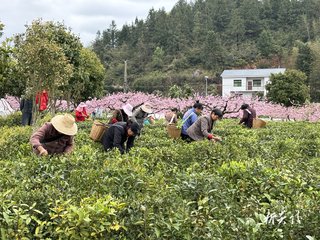近日,在炎陵县霞阳镇石子坝村万阳红现代农业科技产业园内,百亩桃林花开正艳,千亩茶园吐出新绿,一阵春风拂过,把村庄点缀得生机盎然。茶农们在茶园里一捻一挑忙采新茶,游客们在桃林中赏花留影,一派繁忙热闹景象。