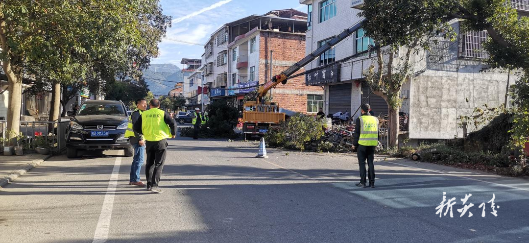 “刚开始商户还不愿意修剪树枝,在我们工作人员的劝导之下,最终还是做通了商户的工作。”水口镇综合执法大队的工作人员说道。在整个修剪树木的工作过程中,除了专业的修剪人员,镇工作人员一边向住户解释劝说,一边疏散来往的人群和车辆,及时组织清运砍下的树枝,保持主路交通顺畅。