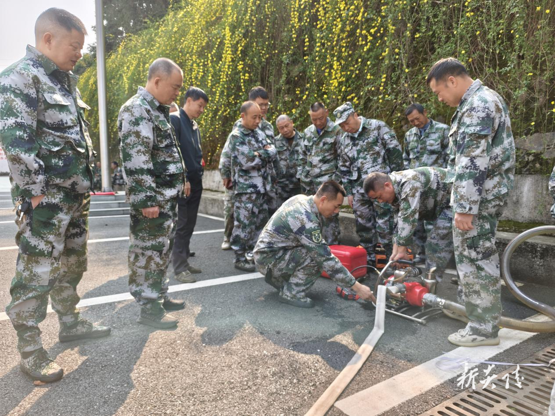 演练第一阶段在乡政府院内开展。乡应急队专业人员通过“讲解+示范”形式,教授干粉灭火器、风力灭火机、油锯、割草机等常用灭火器械的使用方法。参训人员进行设备装卸、启动操作等演练,重点掌握油锯切割角度控制、风力灭火机火场站位配合等关键技术要点。第二阶段演练转场至三口龙村山林区域。随着模拟火情警报响起,应急队员迅速集结,利用高扬程抽水泵压制火头、割草机开辟隔离带、灭火器处置余火,全过程协同配合,所有火点被成功扑灭,火场清理验收合格。