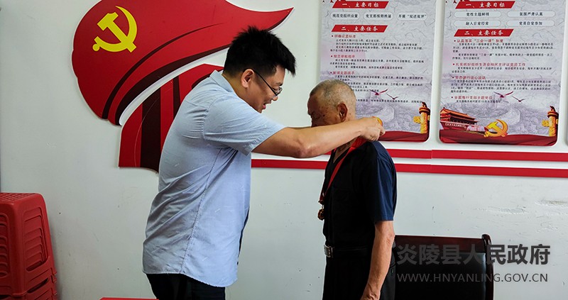 6月23日,炎陵县政府办举行"七一"慰问活动,政府办党组书记、主任向退休支部老党员代表徐开通颁发"光荣在党50年"纪念章,并献上"七一"慰问金。