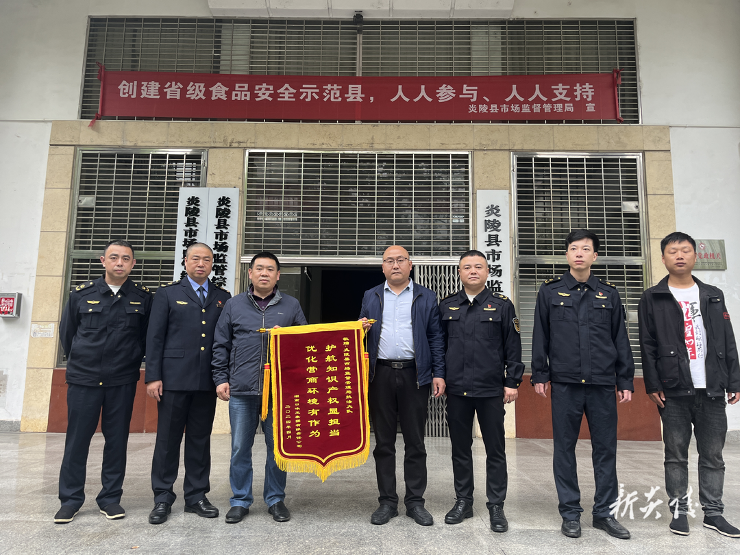 近日,湖南口味王集团有限责任公司工作人员将一面印有“护航知识产权显担当 优化营商环境有作为”的锦旗送到了炎陵县市场监督管理局,对市场监管部门行动迅速、秉公执法、高效打击商标侵权行为和切实维护商标权利人的合法权益表示诚挚感谢,对良好干部作风表示敬意。