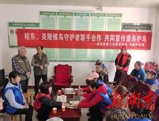 12月2日,中国野生动物保护协会炎陵护飞队联合桂东县星火志愿者协会(桂东护飞队)组织35名候鸟守护志愿者,在桂东县槽里木材检查站举行千年鸟道候鸟迁徙志愿巡护工作座谈会,联手开展保护候鸟迁徒文艺宣传爱鸟护鸟及巡护活动。炎陵县公益志愿者协会会长周新文表示,希望通过此次两队联手巡护宣传活动,提高参与者的爱鸟意识,以及广大公众爱鸟护鸟意识的提高。他们将加强桂东和炎陵交界地区候鸟迁徙通道合作,共同守护千年鸟道安全,确保候鸟迁徙平安过境。