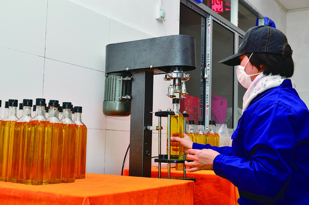 ▲“金紫峰”生产车间,工人灌装茶油。受访者供图