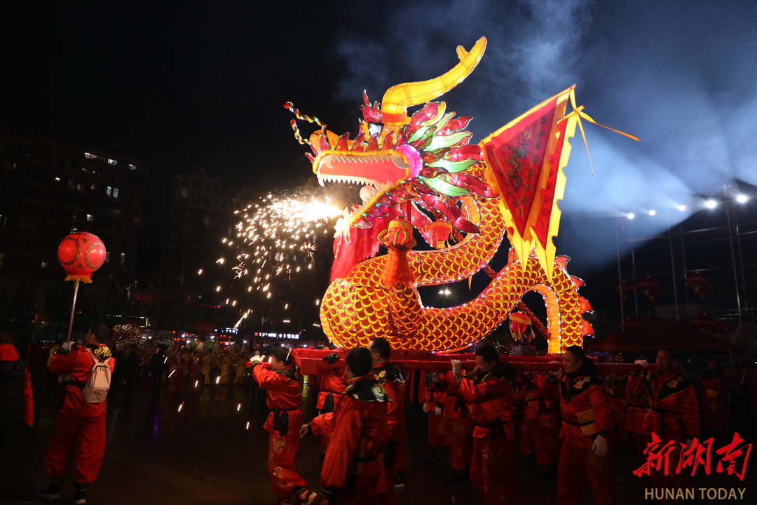 当晚,炎陵县文体中心广场,由15节长龙、九节龙、三人龙、双人狮等组成的《龙年之春》龙狮表演拉开序幕。数十条彩龙在舞台上翻飞腾跃,瞬间点燃现场气氛。