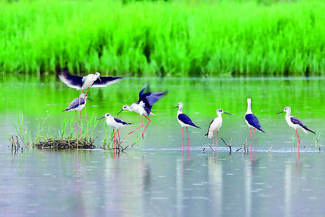 美丽的黑翅长脚鹬在炎陵的山间池塘觅食。资料图片