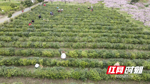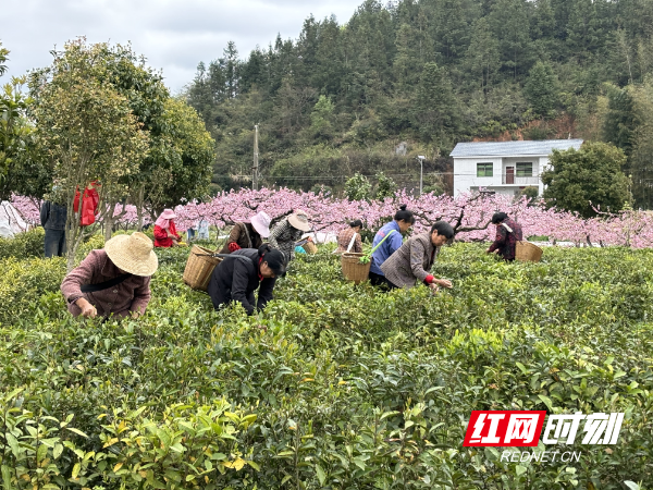 3月25日,在株洲市炎陵县霞阳镇石子坝村万阳红现代农业科技产业园内,百亩桃林花开正艳,千亩茶园吐出新绿,一阵春风拂过,把村庄点缀得生机盎然。茶农们在茶园里一捻一挑忙采新茶,游客们在桃林中赏花留影,一派繁忙热闹景象。