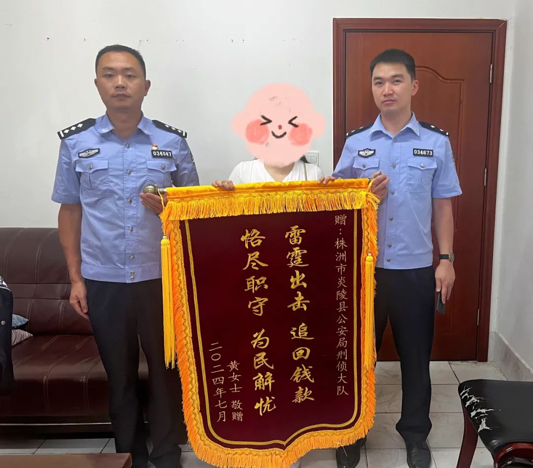 湖南日报·新湖南客户端7月23日讯(通讯员 张旋 龙子琳 唐阳鑫)7月22日,辖区居民黄女士将一面印有雷霆出击,退回钱款,恪尽职守,为民解忧的锦旗送到炎陵县公安局刑侦大队,感谢民警为其追回7万余元被骗资金。