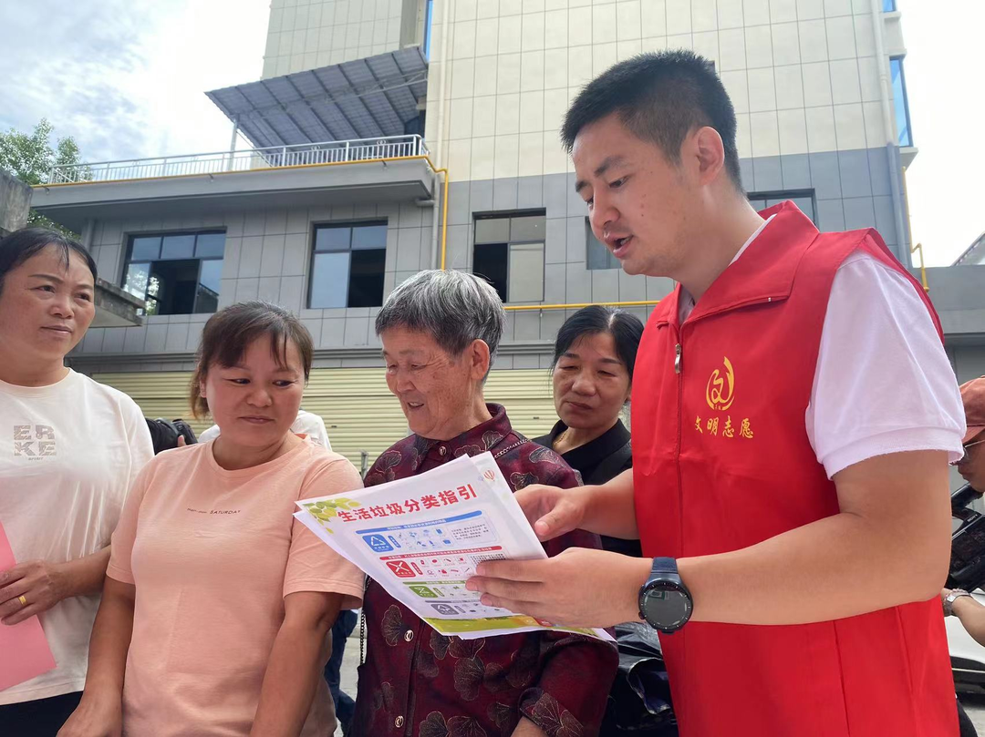 活动中,在炎陵县西区社区的空旷处,志愿者们向来往群众发放垃圾分类宣传资料,通过详细讲解、操作指导、趣味问答等形式,吸引广大群众进一步了解环保知识、提升垃圾分类意识,自觉养成垃圾源头减量和分类投放的文明习惯。