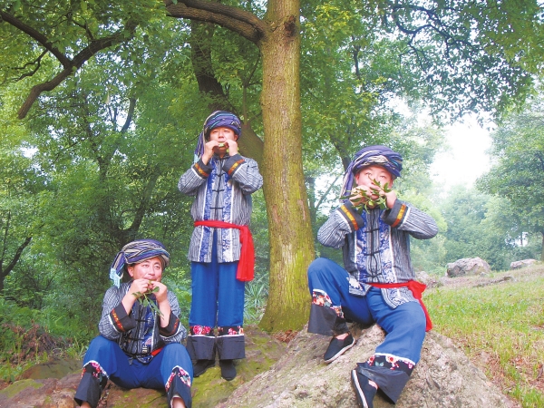 炎陵客家人劳作之余吹奏木叶。谭明勇 供图