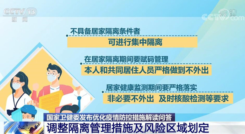 浏览次数: 发布时间:2022-11-14 11:45 央视网消息:国务院联防联控机制11日发布关于进一步优化新冠肺炎疫情防控措施、科学精准做好防控工作的通知,通知明确了进一步优化防控工作的二十条措施。今天(11月13日),国家卫生健康委发布《关于进一步优化新冠肺炎疫情防控措施 科学精准做好防控工作的通知》解读问答,对《通知》出台的背景、优化和调整的具体内容等进行了详细解读。先来看看对隔离管理及风险区域划定方面的调整。
