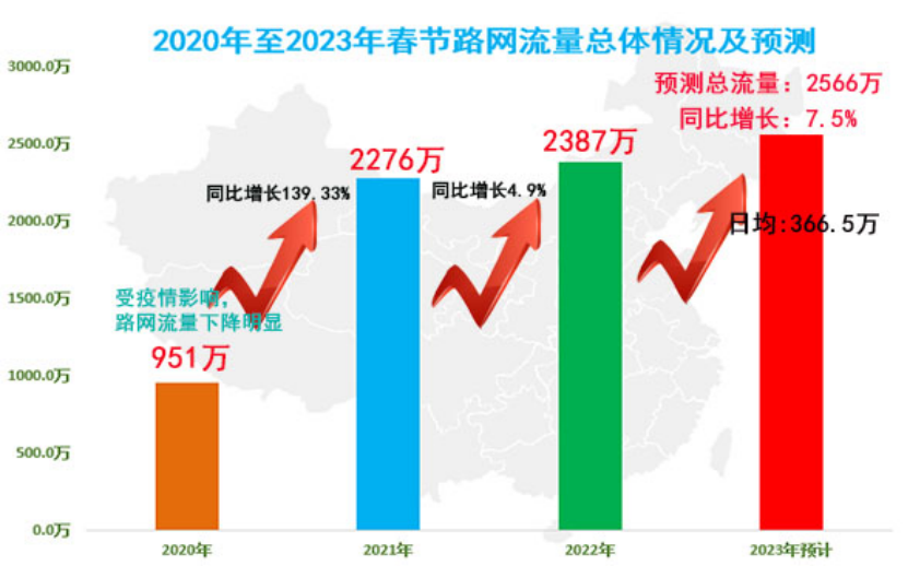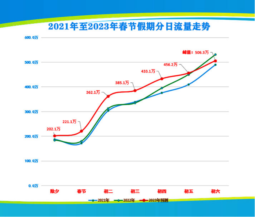 预计2023年春节期间全省高速公路出入口通行车辆总数为2,566万辆次,同比增长约7.5%,日均流量366.5万辆次,是平日的1.7倍。峰值日出现在正月初六(1月27日),峰值日流量为506万辆次,是平日的2.36倍。预计春节期间跨境流量约为193万辆次,较2022年增长27.3%。
