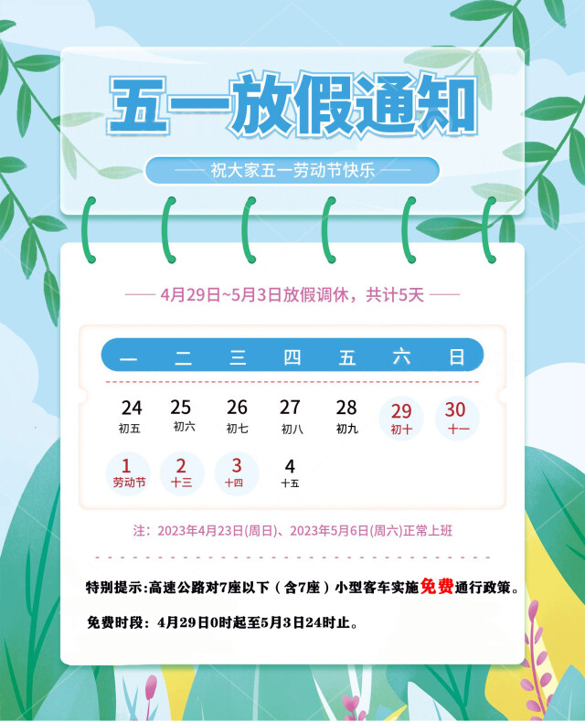 4月25日,2023年“五一”假期全省高速公路路网运行态势研判专报发布:“五一”假期5天,高速公路对7座以下(含7座)小型客车实施免费通行政策,免费时段从4月29日0时起至5月3日24时止,以驶离出口收费车道的时间为准。