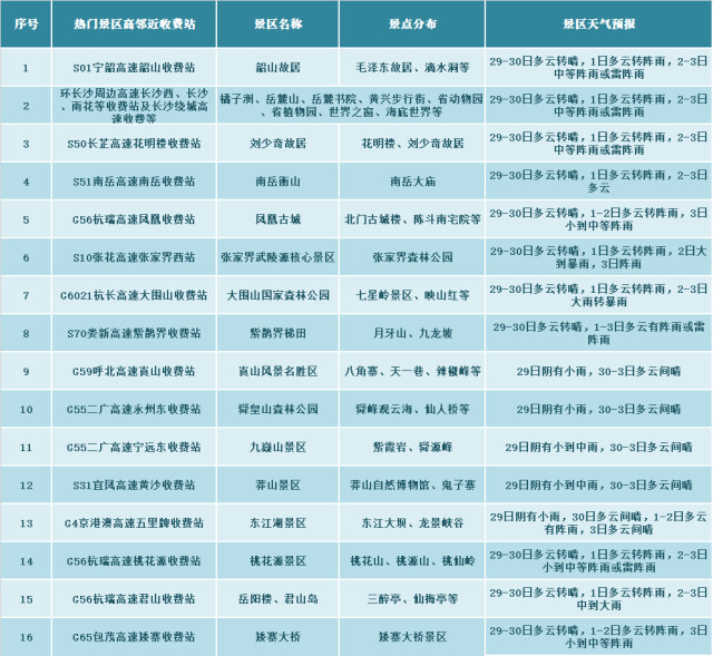 高速公路周边主要景区预览表