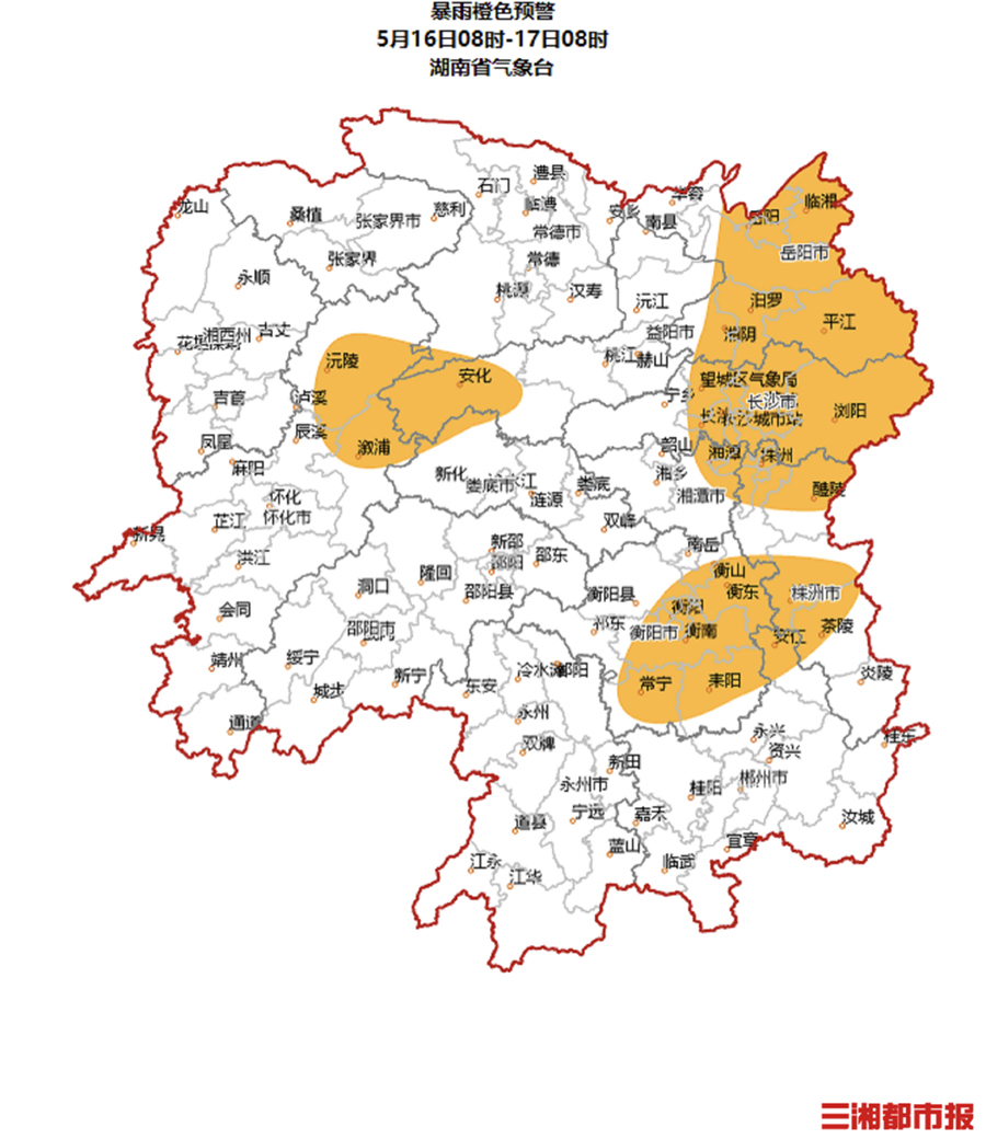 湖南省气象台5月16日06时发布暴雨橙色预警: