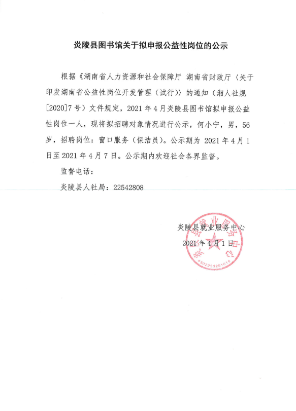 炎陵县图书馆关于拟申报公益性岗位的公示