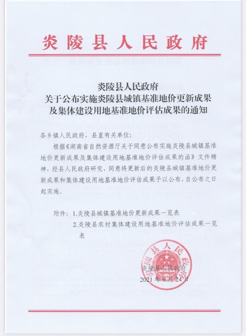 关于公布实施炎陵县城镇基准地价更新成果及集体建设用地基准地价评估成果的通知