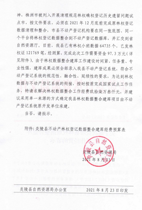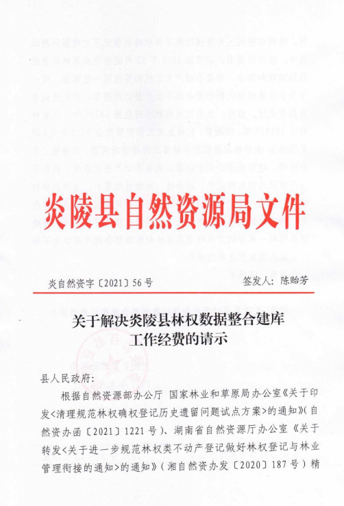 文件下载:关于解决炎陵县林权数据整合建库工作经费的请示 炎自然资字(2021)56号
