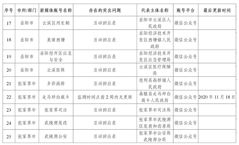 (三)政务新媒体运维管理仍需规范。本季度检查共有44家政务新媒体存在突出问题,其中37家为微信公众号未提供有效互动功能,占比84.09%,个别政务新媒体为满足更新检查要求,转发天气预报、央视新闻等与本部门职能职责无关内容。益阳市、张家界市和岳阳市所主管的政务新媒体中分别有11家、10家和8家存在突出问题,监管工作需进一步加强。